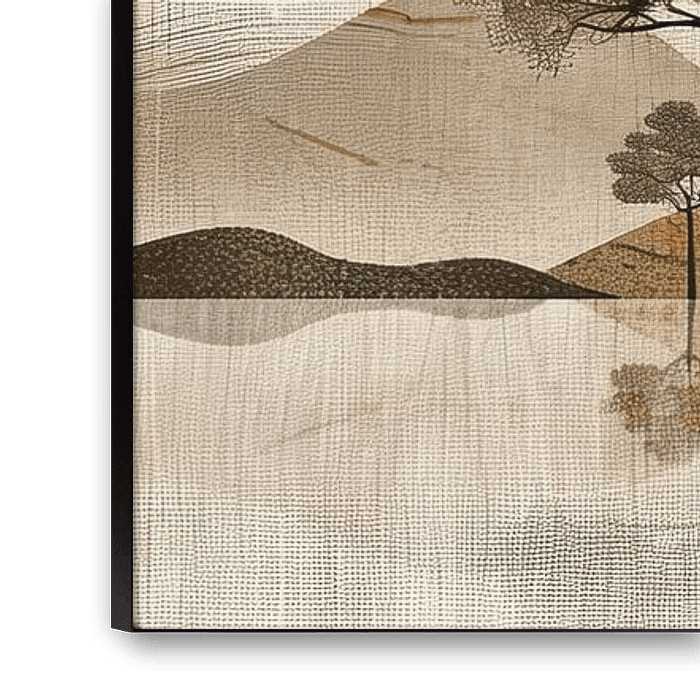 Eternal Calm Under the Moon - Dit landschapsschilderij dompelt ons onder in een serene, bijna dromerige scène waarin de natuur centraal staat. We zien een uitgestrekte vlakte onder een overweldigende, heldere hemellichaam, vermoedelijk de maan, die een zachte, diffuse gloed over het tafereel werpt. Op de voorgrond staan een aantal bomen, waarvan één opvallende boom, vermoedelijk een soort eik, met een rijk gedetailleerde kruin die een statige aanwezigheid markeert. Deze boom, samen met enkele kleinere bomen, wordt weerspiegeld in een wateroppervlak, wat een spiegelachtig effect creëert op de voorgrond. Achter deze bomen zien we zacht glooiende heuvels bedekt met een mozaïek van bruine en oranje tinten, die de aardse textuur en warmte van de scène verhogen. De lucht is gevuld met tinten beige, wat een gevoel van vredigheid en onberoerde stilte uitstraalt.