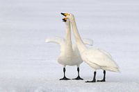Wilde zwanen in de winter op het ijs van het prachtige diepgevroren meer Kussharo, een calderameer in het Akan National Park in het noordoostelijke deel van Hokkaido, Japan.
