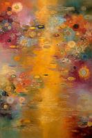 Een gouden stroom licht trekt door een spiegelend wateroppervlak, omringd door zachte vlekken in rood, roze en blauw. Het werk ademt rust en beweging tegelijk, een visuele meditatie. Water staat in vele tradities voor vernieuwing en zuivering, een bron van eeuwige kracht.