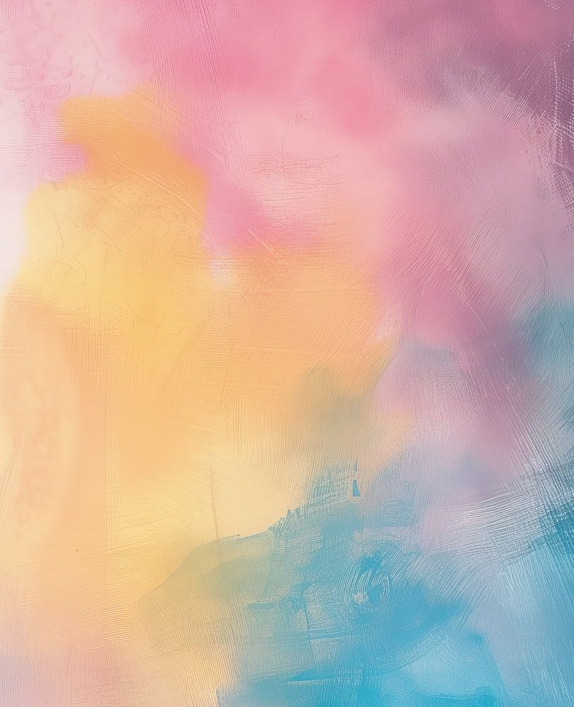 Dit abstracte schilderij vangt een droomachtige sfeer met zijn delicate samenspel van warme en koele tinten. In het middelpunt van de compositie stralen zachte nuances van blauw, oranje en roze, die doen denken aan een gloedvolle zonsondergang of een innerlijk licht. Deze warme kleuren vloeien geleidelijk over in gedempte tonen van groen, blauw en grijs naar de randen toe, wat een gevoel van diepte en mysterie creëert.