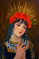 Het kunstwerk "Ethereal Reverie - Een Hommage aan Klimt" is een adembenemend schilderij dat een eerbetoon brengt aan de beroemde Oostenrijkse kunstenaar Gustav Klimt. Het is gemaakt door de hedendaagse kunstenares Maureen Kroep die geïnspireerd is door Klimt's unieke stijl en symbolische kunst.