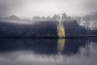 A tree still wearing its bright autumn colors against a backdrop of dying leaves on a misty winter day. The contrast between the bright yellow and the surroundings created a surreal atmosphere, enhanced by the water reflection and the ghostly impressions I managed to create with intentional movements of the camera.