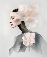 Fantasie profiel portret van een vrouw gehuld in grijze tule en lichtroze bloemen.