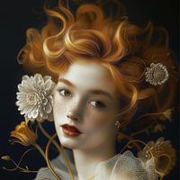 Portret van een meisje met gouden haren en een wit porceleinen huid met sproeten en blosjes. De wit en gouden bloemen in dezelfde kleurstelling als haar haar en haar teint samen met het textiel van haar jurk complementeren het geheeld. Afgezet tegen een zwarte achtergrond geeft het een surrealistisch mooi dromerig beeld. Dahlia's, tulpen en margrietjes. Passend bij diverse stijlen en trends, waaronder portret, nostalgie, romantiek, bloemen. Artist: Bianca ter Riet