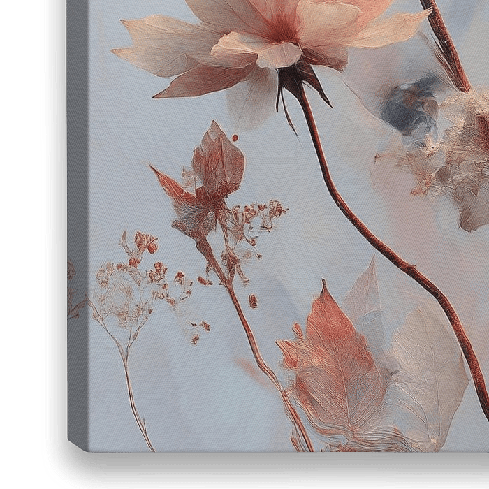Een dromerige, soft-focus compositie van tere bloemen in warme koraal-, crème- en gedempte blauwtinten, die de grenzen tussen werkelijkheid en fantasie vervagen.