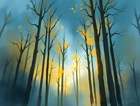 Deze afbeelding toont een gestileerde weergave van een dicht bos met een mystieke of etherische kwaliteit. De bomen zijn hoog en slank, hebben geen bladeren en zijn weergegeven in donkergrijs tegen een lucht met kleurverlopen die overgaat van een lichter, nevelig blauw aan de horizon naar een dieper, meer gedempt blauwgrijs aan de…