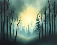 Deze afbeelding toont een serene en enigszins mistige bosscène met een centrale lichtuitbarsting. Het licht wordt gefilterd door de hoge, silhouet bomen, waardoor een focuspunt en een gevoel van diepte ontstaat. Het kleurenpalet is gedempt, met zacht groen, blauw en geel dat overheerst, wat bijdraagt aan een rustige en enigszins etherische sfeer. De bomen zijn slank en hebben geen bladeren, wat duidt op een mogelijk winters of slapend seizoen. De grond wordt bedekt door een laaghangende mist of nevel, wat bijdraagt aan de mysterieuze en vredige sfeer. De algehele compositie is evenwichtig, met het licht dat de blik van de kijker trekt'terwijl de bomen een kader en een gevoel van beslotenheid bieden.
