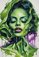 Het meest opvallende aspect is de levendige groene, bijna neon, substantie die lijkt te smelten en te druipen van haar haar en gezicht. Dit vloeibare element heeft de dynamiek en vorm van gesmolten was of dikke verf, die de zwaartekracht trotseert en op een gecontroleerde manier langs haar contouren stroomt. De textuur is glanzend en lijkt bijna tastbaar, met hoogtepunten en schaduwen die de viscositeit en beweging suggereren.