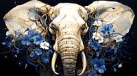 De gouden en ivoorkleurige tinten van de olifant contrasteren prachtig met het levendige blauw van de omringende bloemen. Er is een gevoel van majesteit en rust die uitstraalt van het dier, terwijl de bloemen…