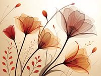 Dit kunstwerk is een delicaat en dromerig arrangement van doorschijnende bloemen. De bloemblaadjes, weergegeven in zachte kleuren rood, oranje en crème, overlappen en versmelten, waardoor een gevoel van diepte en etherische schoonheid ontstaat. De stelen zijn slank en donker en vormen een subtiel contrast met de lichtgevende bloesems.…