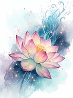 : Een delicate aquarelweergave van een lotusbloem in volle bloei. Zachte roze en crèmekleurige tinten mengen zich naadloos over de sierlijke bloemblaadjes, geaccentueerd met subtiele paarse accenten aan de uiteinden. De centrale meeldraad is een levendige uitbarsting van geel, die een centraal punt toevoegt aan de serene compositie. De…