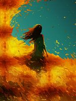 Dit betoverende kunstwerk legt de stille schoonheid vast van een vrouw die midden in een gouden veld staat, haar silhouet verlicht door een wervelende golf van licht. Het werk portretteert een etherische figuur met wapperende haren, schijnbaar verloren in een moment van introspectie. De levendige goudtinten gaan naadloos over in het diepe blauw en groen van de achtergrond en roepen een gevoel van mysterie, verwondering en sereniteit op.