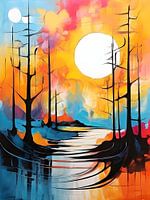 Dit levendige digitale schilderij toont een surrealistische zonsondergang boven een rustig waterlichaam, mogelijk een meer of een kalme zee. Afgeschilderde, bladerloze bomen steken scherp af tegen een vurige lucht met oranje, gele, roze en blauwe tinten. De grote, felle zon domineert rechtsboven, werpt een lichtgevende gloed over het tafereel en weerspiegelt in het stille water eronder. De weerspiegelingen zijn gestileerd met krachtige, langgerekte streken wit en grijs, die een dynamische en toch vredige kwaliteit aan de compositie toevoegen. De algehele sfeer is er een van serene schoonheid en buitenaardse rust.