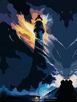 Een adembenemend digitaal kunstwerk van een torenhoge vuurtoren tegen een dramatische stormachtige lucht. Het samenspel van diepblauw, vurig oranje en gloeiende reflecties creëert een betoverende, bijna buitenaardse sfeer. De symmetrische elementen voegen een surrealistisch tintje toe, waardoor de scène zowel krachtig als mystiek aanvoelt. Perfect voor liefhebbers van nautische thema's, fantasielandschappen en sfeervolle kunst. Een ideaal statementstuk voor moderne interieurs, dat diepte, mysterie en een gevoel van avontuur toevoegt.