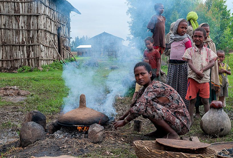 Dorpeling kookt eten bij het Tara meer (Ethiopie). Route tussen Wereta en Aboab.