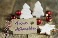 Koop de foto Etiket met handgeschreven groet in het duits, Frohe Weihnachten van Alex Winter op canvas, aluminium dibond, (ingelijste) fotoprint, behang en ArtFrame, op maat geprint in Fine-Art kwaliteit.