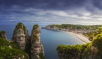 Het dorp Étretat en het strand van de baai, luchtfoto vanaf de klif. Regio Normandië, Frankrijk, Europa.