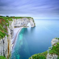 Etretat, la Manneporte natuurlijk boogwonder, kliffen en strand. Foto met lange belichting. Normandië, Frankrijk.
