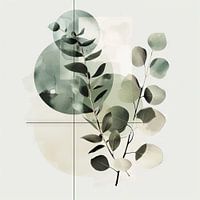Dit kunstwerk combineert de natuurlijke schoonheid van eucalyptusbladeren met een geometrische esthetiek. De verschillende vormen en lijnen op de achtergrond komen harmonieus samen en plaatsen de tak in het middelpunt van de belangstelling. De zachtgroene tinten en het slimme ontwerp maken dit stuk een perfecte aanvulling voor moderne en stijlvolle ruimtes. Dit schilderij is ideaal voor liefhebbers van geometrische kunstwerken en natuurmotieven en straalt een gevoel van evenwicht en esthetiek uit.