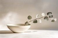 Dit ontwerp straalt rust en eenvoud uit. De delicate eucalyptus tak ligt in een minimalistische, matte witte kom, waarbij de zachte tinten van het groen en beige harmonieus samengaan. Door de subtiele lichtinval wordt een serene sfeer gecreëerd, perfect passend bij een modern of Scandinavisch interieur. Deze foto kan gebruikt worden als stijlvol decoratief element in diverse woonruimtes, van de slaapkamer tot het kantoor. Het ontwerp benadrukt de schoonheid van eenvoud en natuurlijke elementen, en is een ideale keuze voor liefhebbers van minimalisme en een rustige leefomgeving.