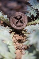 Deze eucalyptus knop oogt bijna als een echte knoop voor aan een jas. De knoppen lagen op de grond onder eucalyptusbomen van een bos in Portugal.