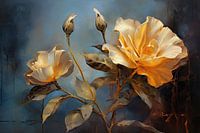Eucalyptusbloem | Shadows and Light in Bloom - Dit bloemenschilderij toont een elegante weergave van de eucalyptusbloem, compleet met gouden tinten die sierlijk contrasteren tegen een donker achtergrond.