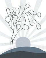 Minimalistisch landschap met een donkerblauwe lijntekening van een eucalyptusboom, een blauwe zon met zonnestralen en twee heuvels in blauw. De illustratie met een aquareltextuur is geschikt voor elke kamer.