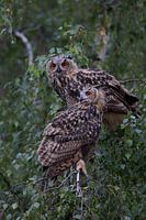 Eurasian Eagle Owl / Europaeische Uhus ( Bubo bubo ) two young owls perched side by side in a birch tree, at dusk, wildlife, Europe.