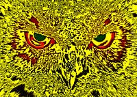 Gelbschwarze Grafik eines Eulengesichtes mit starrem Blick