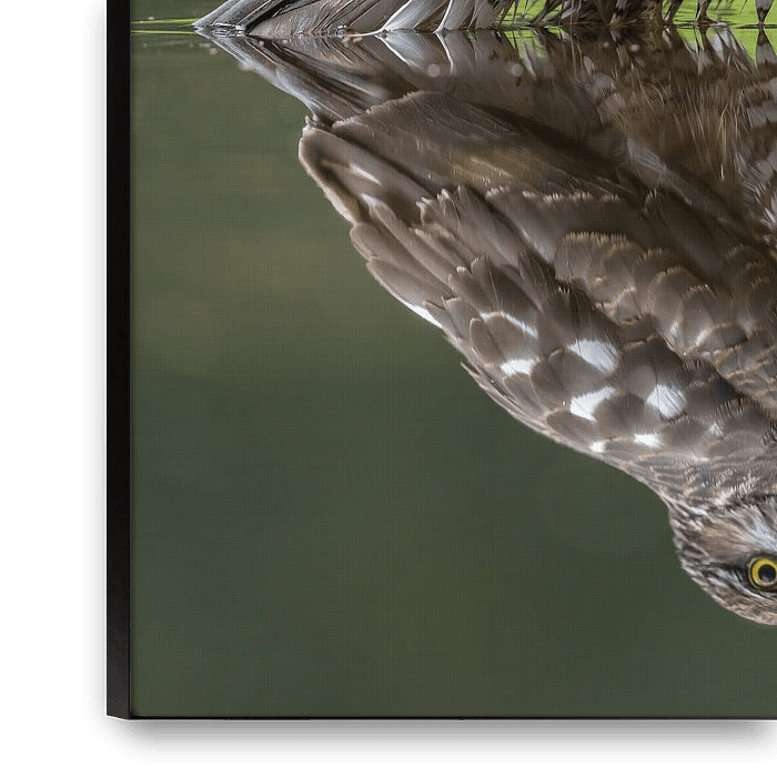 An awesome Sparrow Hawk (Sperwer in Dutch) taking its daily bath in a waterhole down a Dutch forest. The water provided for a great sharp and clean mirroring of the Sparrow Hawk. Two Sparrow Hawks for the same price! Imagine this image framed at your wall!