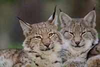 Head portrait of two Eurasian Lynx / Eurasischer Luchs ( Lynx lynx ) laying next to each other, Europe.