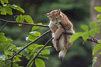 Eurasischer Luchs ( Lynx lynx ), verspieltes Jungtier im Stress, klettert in einem Baum, versucht sich irgendwie zu halten, lustiges Bild, süße Tierkinder, Kätzchen