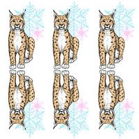 Zes parmantige lynxen kijken je aan. Ze vormen een patroon, samen met twee sneeuwvlokken, die de achtergrond vormen. De kleuren zijn zacht; twee pastelkleurige ijskristallen en de beige vacht van de Euraziatische lynx.