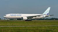 Deze Triple Seven van het Portugese EuroAtlantic Airways vertrekt vanaf de Polderbaan van luchthaven Schiphol. Dit toestel is ingehuurd door Surinam Airways om de vlucht tussen Amsterdam en Paramaribo te verzorgen.
