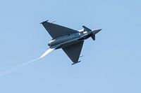 Eurofighter Typhoon van de Spaanse Luchtmacht vliegt onderste boven tijdens een demonstratie op de Luchtmachtdagen 2019.