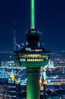 Een blik op de Euromast met op de achtergrond de Rotterdamse haven, altijd in bedrijf, 24/7