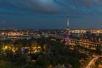 De Euromast rood, wit en blauw verlicht tijdens bevrijdingsdag. Op de achtergrond is de SS Rotterdam te zien.