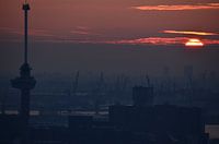 De Maas en de Rotterdamse haven gefotografeerd vanaf The Red Apple(127 M) met zicht op de Euromast(185M)en als achtergrond de ondergaande zon.