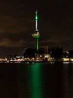 De verlichting van de Euromast verheft dit icoon om naar een hoger niveau. In dit geval toont de Euromast trots het groen-wit-groen van de Rotterdamse vlag.