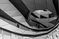 Detail van het opvallende Euronews gebouw in de wijk Confluences in de Franse stad Lyon. Op de plaats van de oude dokken aan de Sâone is een wijk vol prachtige, moderne architectuur verrezen.