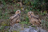 Europäische Uhus ( Bubo bubo ), zwei Jungvögel, Ästlinge, sitten nebeneinander im Abhang eines Steinbruches, süße Tierkinder, wildlife, Deutschland, NRW