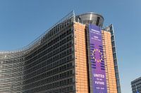 Brussels Belgium.European institutions in the European Quarter. The Berlaymont building which houses the headquarters of the European Commission, the executive branch of the European Union (EU).Banner “United for our future” (Verenigd voor ons toekomst, Unis pour notre avenir.)Europe, Union, EU ,