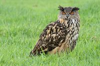 Een portret van een Europese Oehoe rustend in een weide. Dit zijn indrukwekkende uilen met prachtige oranje ogen.