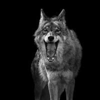 De Europese Wolf, Canis lupus lupus, deze foto is van een wolf in gevangenschap. De kleur van de ogen is aangepast door de fotograaf. Foto is in zwart/wit maar kan ook in kleur (zie de andere foto's in deze serie). Op verzoek kan ook de ogenkleur aangepast worden. Neem dan even contact op.