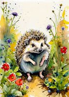 Een Europese egel in aquarelverf is afgebeeld met zachte, delicate stekels in bruine, bruine en crèmekleurige tinten, waardoor een gestructureerd, stekelig uiterlijk ontstaat. De zachte, ronde vorm van de egel wordt aangevuld door subtiele penseelstreken die zijn nieuwsgierige en verlegen aard weergeven. Zijn kleine, donkere ogen en neus worden benadrukt, wat charme en persoonlijkheid toevoegt. De zachte wassingen op de achtergrond roepen een vredige, natuurlijke omgeving op, wat de stille aanwezigheid van de egel versterkt terwijl hij rustig zijn bosomgeving verkent.