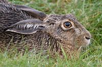 Europese haas ( Lepus europaeus ), close-up van een rustende haas, zeer gedetailleerd, fijne scherpte, wilde dieren, Europa.