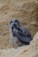 Europese oehoe ( Bubo bubo ), jonge vogel in een zandbak, nog in een donkere jurk, kijkt onbegrijpelijk in de camera, grappige uitdrukking, wild.