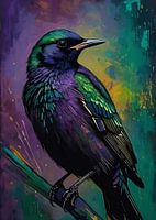 De Europese spreeuw schittert in clair-obscur, zijn iriserende verenkleed glinstert in diep groen en paars dat levendig oplicht tegen de duisternis. Schilderachtige streken brengen de metaalachtige glans van elke veer naar voren, waardoor een gevoel van beweging en leven ontstaat, zelfs in stilte. De schaduwrijke omgeving versterkt de schittering, waardoor de vogel een bijna kosmische allure krijgt. Dit kunstwerk is gedurfd en toch elegant, en transformeert een bekende vogel in een stralend onderwerp van verwondering en verfijning, ideaal voor verzamelaars die op zoek zijn naar dramatische schoonheid.
