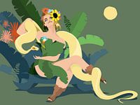 Digitale illustratie van een vrouw in de Hof van Eden in heldere kleuren.