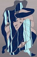 Grafische tekening/collage van een model en blad in blauwe kleuren.